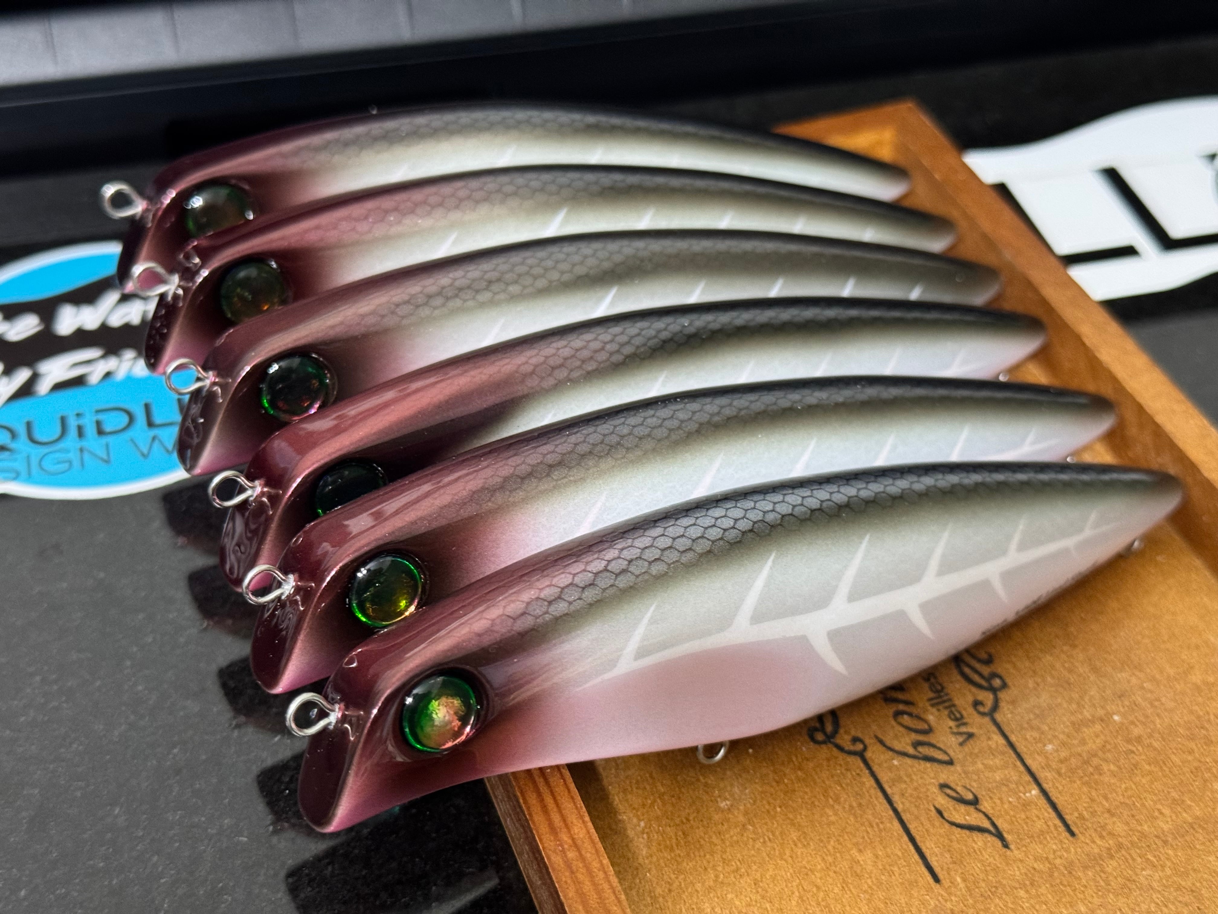 カラー:ピンキーサンライズ Length:99mm Weight:17.5g±(推奨フックサイズ#3装着時) Renge:10~60cm スローな巻きではほぼ泳いでいるようには見えませんが、 ある速度域を超えたあたりから細かくロールの動きが入りだします。 特にナイトゲームではその速度域を確認したうえで、泳がせるのか波動弱く移動させるだけなのかを意識してください。 軽くロッドを煽って潜行させたのちユラユラと泳がせるのも一つの使い方。 また、ジャーク等で積極的に動かす使い方も出来ます。 リキッドルアーでは初めてデイゲームでの使用も意識して作ったルアーです。 ナイトゲームでもデーゲームでも、「動」と「静」を使い分けて使用するとこのルアーの特徴が生きると思います。 浮力をやや弱めにしていますので、レンジを入れてからのスローでのレンジキープもやりやすいと思います。 ユーザーさんがどんな使い方で釣るのか、とても楽しみです。 ※ジッパー付きソフトパッケージ入り ※フック及びリングは付属しません。